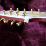 The Bloodraven is a 10 string, fanned fret, through neck, solid body electric mandolin with a brass nut and wooden pickup rings and covers. The neck pickup is a Seymour Duncan ’59, and the bridge pickup is a Dimarzio X2N. It has a 3 way switch, a master volume knob, and a tone knob for each pickup.