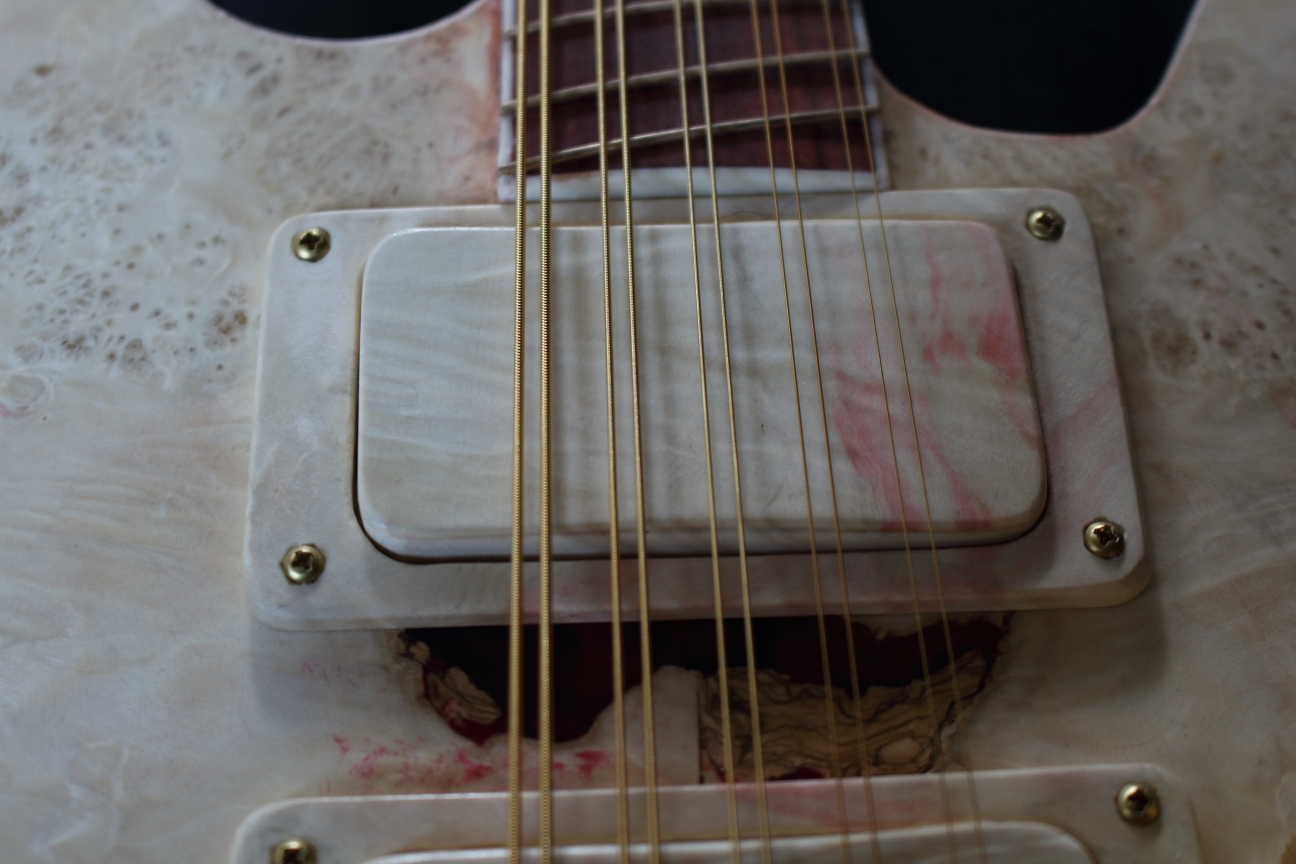 The top, bottom, and headstock veneer are bleached box elder maple, and the body is bloodwood. The neck is laminated bird’s eye maple and bloodwood, with a bloodwood fretboard, with Jescar Evo Gold narrow fretwire. The headstock features Grover locking tuners and a brass nut I fabricated from scratch. I also fabricated the bridge plate myself and scavenged the saddles from a Gotoh 12 string bridge. The screws and springs I had to scour the internet for to get all the right sizes. The voids in the box elder are filled with dyed resin.